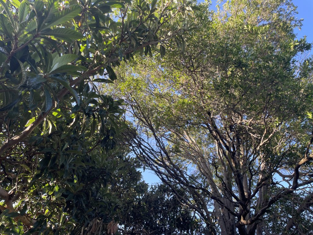 Those leaves, with their various greens, the way the sunlight lands on each one to produce so many shades of the same colour — they comfort and dazzle me. Those long, branching arms that stretch forth, dull in colour and rich in texture, their unpredictable turns and surfaces, their many fingers of connected twigs that reach out in every direction, ending in shiny, precious green adornments that so generously emit oxygen for us to breathe. And beyond, through the gaps in the canopy, hovers high the glorious expanse that is the sky.